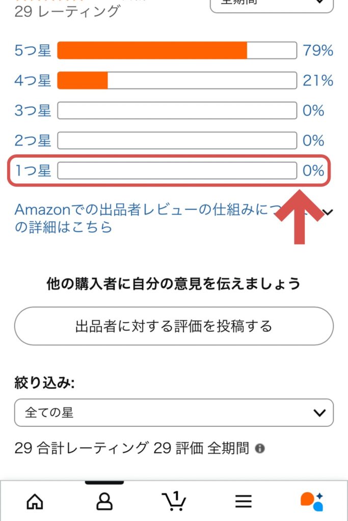※ちなみにAmazonの評価ページでは「星1評価:0件」となっていても、当該ボタンをクリックすると見え消し表示で星1評価が確認できることがあります。